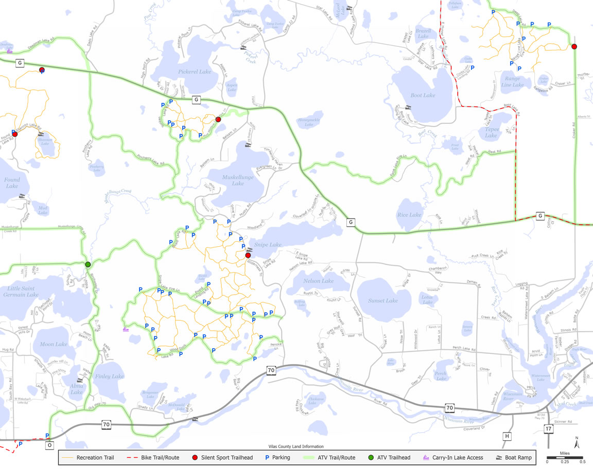 A scenic drive on CTH G heading southeast to Eagle River, east of Sayner off CTH N, takes you past many town and county forest roads that Cloverland has to offer accessing Pickeral, Muskellunge and Snipe Lakes and a wilderness that is quiet and serene.